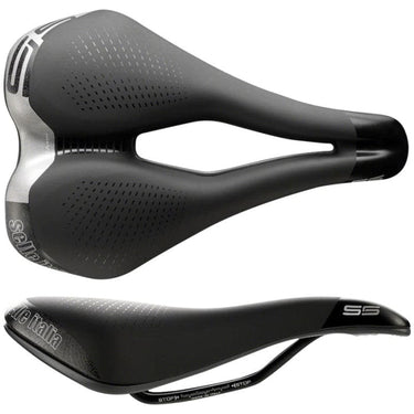 The Max S 5 Superflow saddle is ideal for gravel, road cycling, and touring. It's specifically created for a comfortable, more upright riding position, but maintains the style of Selle Italia’s iconic Flite saddle, which has been a hallmark of elegance and comfort for 30 years. It features a flat profile atop TI 316 rails, which are lightweight yet strong. It’s been updated with a wide central “Superflow” cut-out for pressure relief, a shock-absorption system between the shell and the rail and a durable black Fibra-Tek microfiber cover in black or white that ensures great looks and a long life.