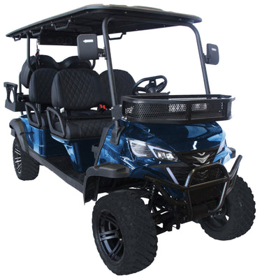 The TrailMaster TBM X6 is a an electric (6 SEAT) golf cart with a 48v system centered around a 5kw 105ah battery. At full charge it is capable of an average 48-mile range at an average of 20mph for between 2 to 3hours depending on terrain. With a foldable windshield, carbon fiber steering wheel, 22” aluminum rims and led head lights and blinkers this is machine turns heads. It has a high strength carbon steel frame with comfortable cushion seats front and rear. The rear facing seat folds down to have a place to carry items as it lays completely flat. It also has a cooler under neath the rear seat as to hold whatever cold drinks you need. It has a standard 10” LED touch screen which comes standard with Apple Car Play and Android auto to navigate anywhere. The touch screen also has a radio you can play across the 3 speaker system: 2 down low in front of the seat and one up high behind your head near the roof. The hard roof is ringed on the inside with led lights that can be switched on and off on the dash. With a ground clearance of 13” this lifted cart can take you most anywhere.