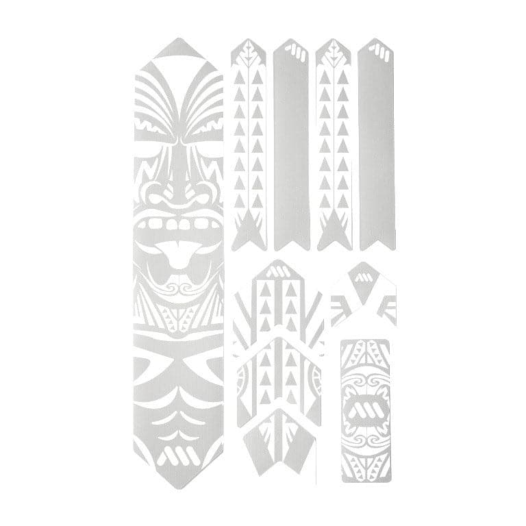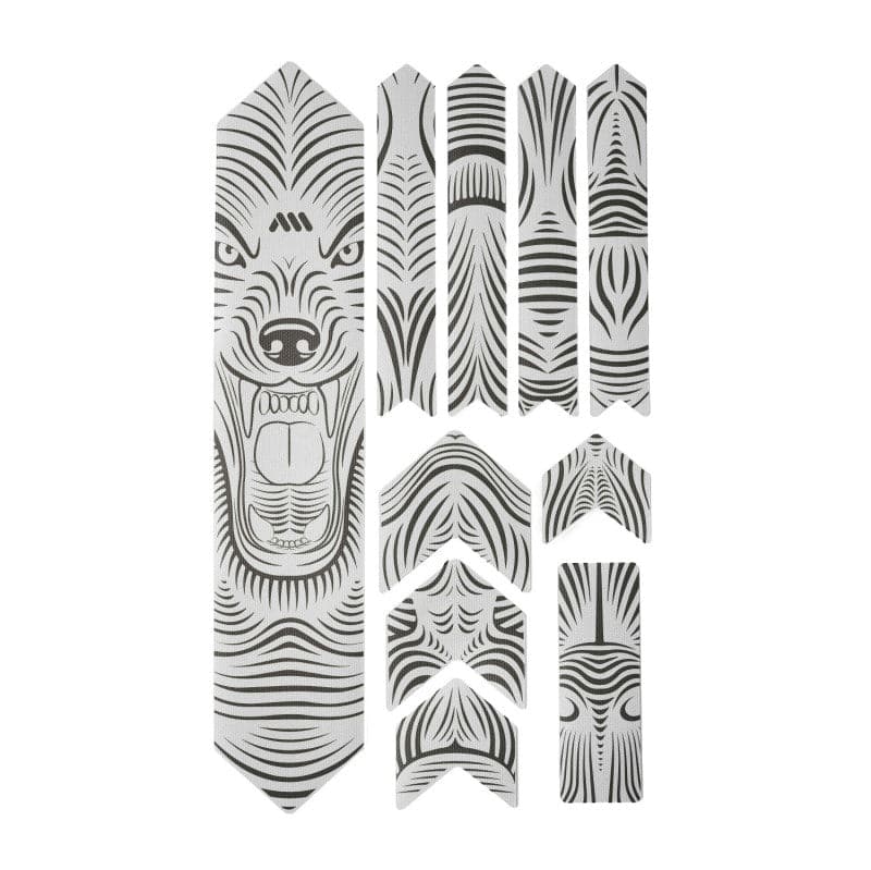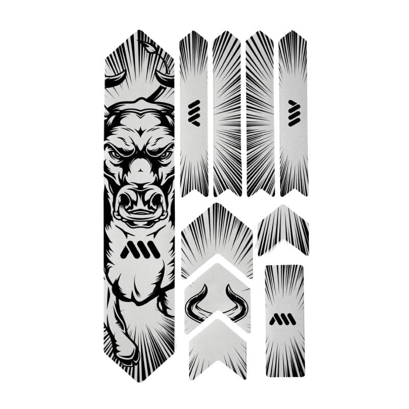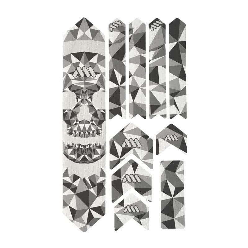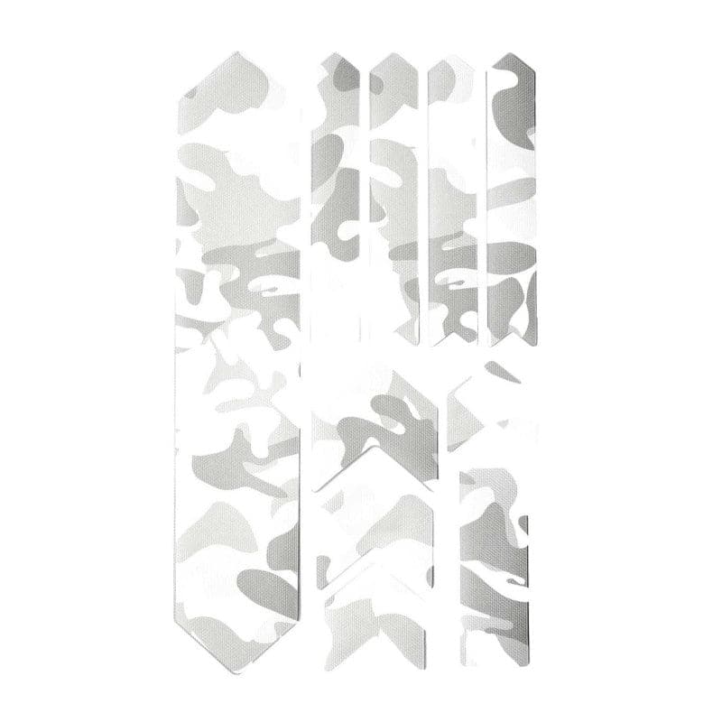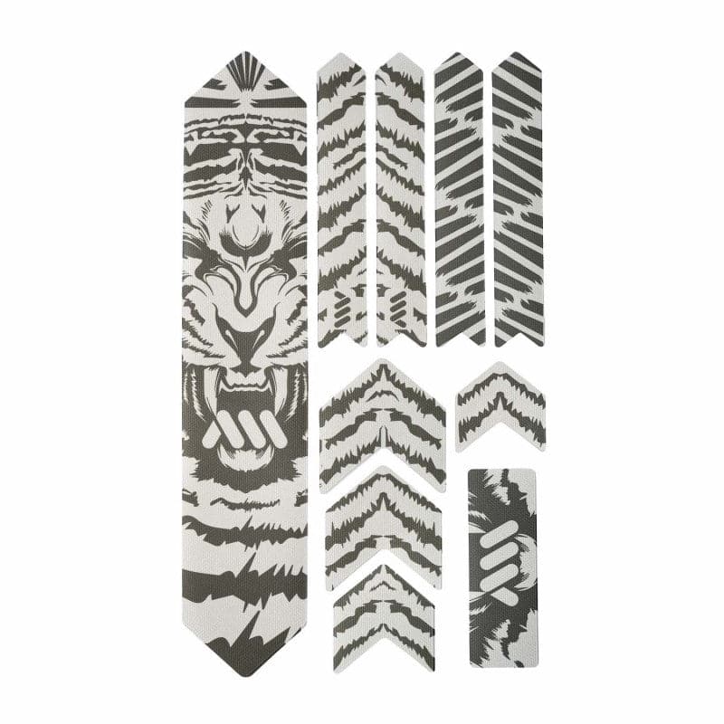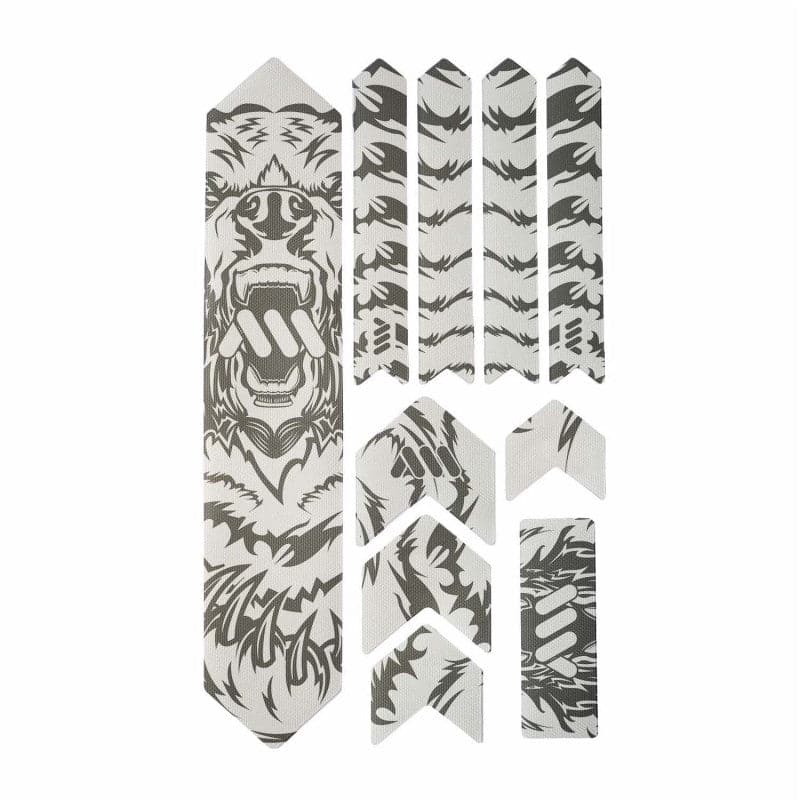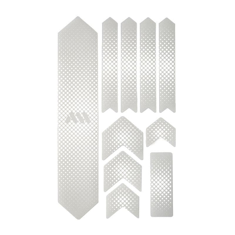 - 10 parts for a universal protection system: 1 big part for the down tube; 4 arrow parts for extending the down tube protection or top tube, 4 parts for the chainstay; 1 rectangle for cable wear protection or other uses.